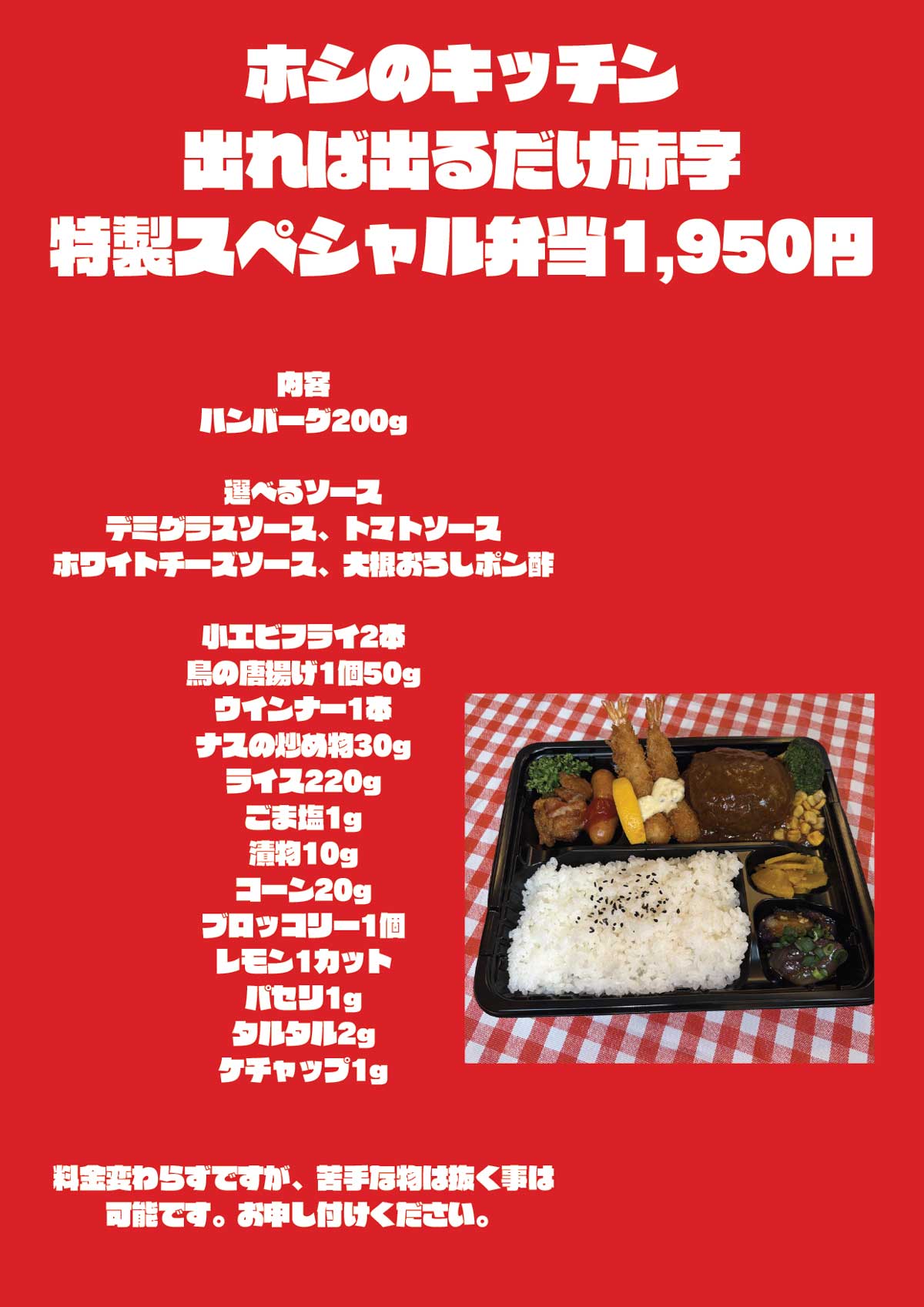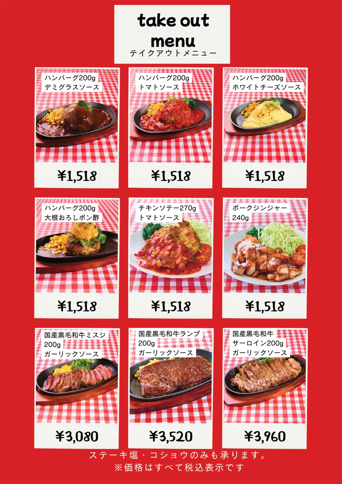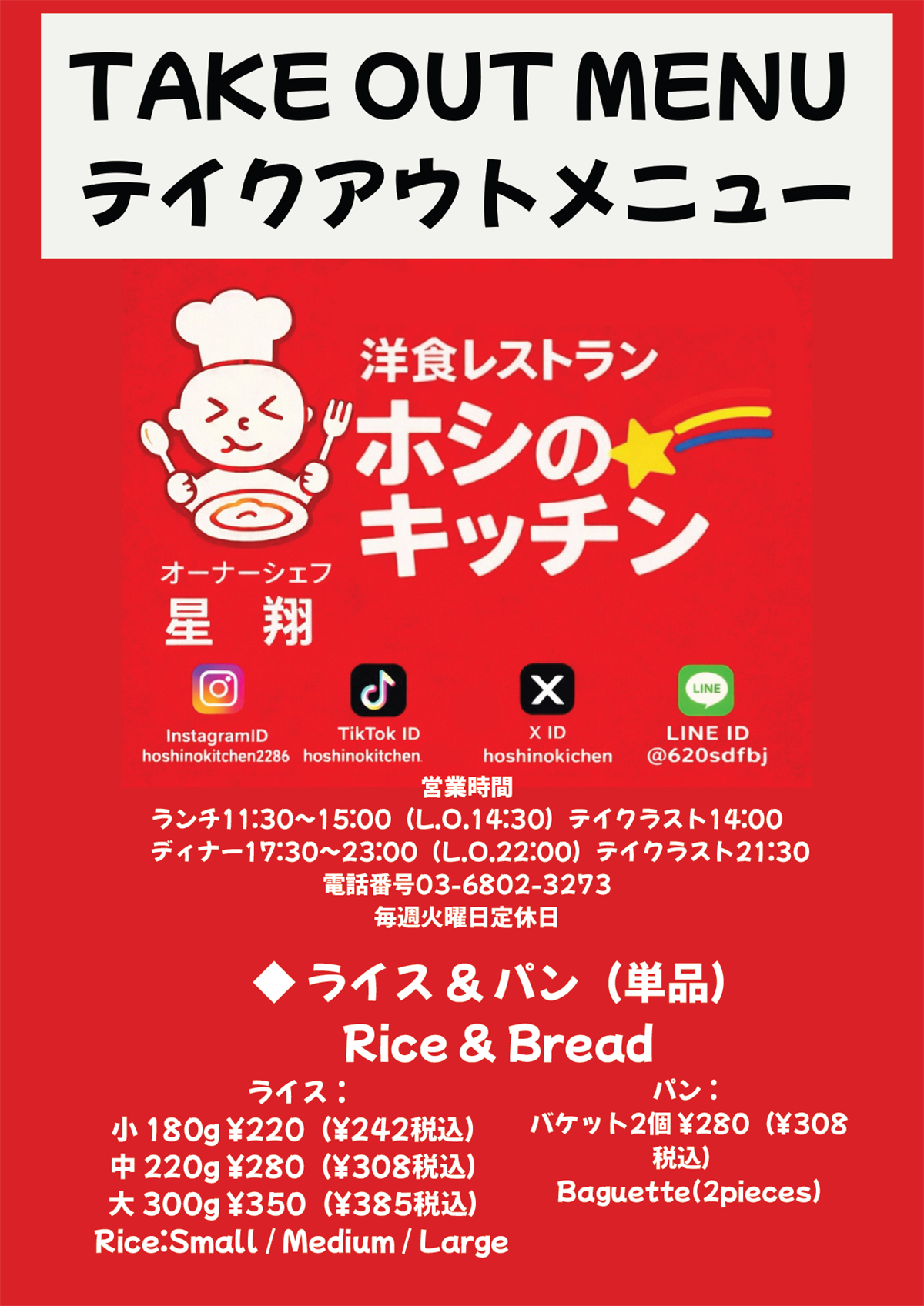 ご自宅でもホシのキッチンのハンバーグなど、洋食メニューをお楽しみいただけます。 なお、店内の混雑状況により、テイクアウトのお渡しまでお時間をいただく場合がございます。 あらかじめご了承いただけますと幸いです。